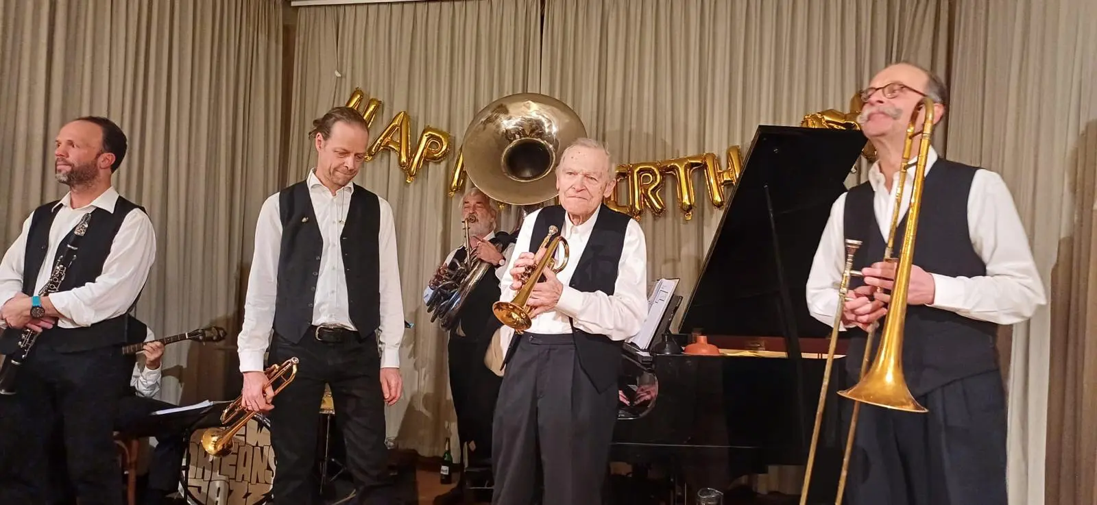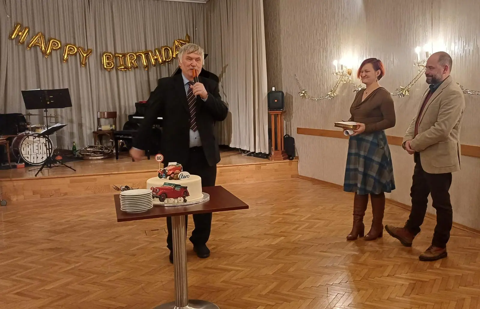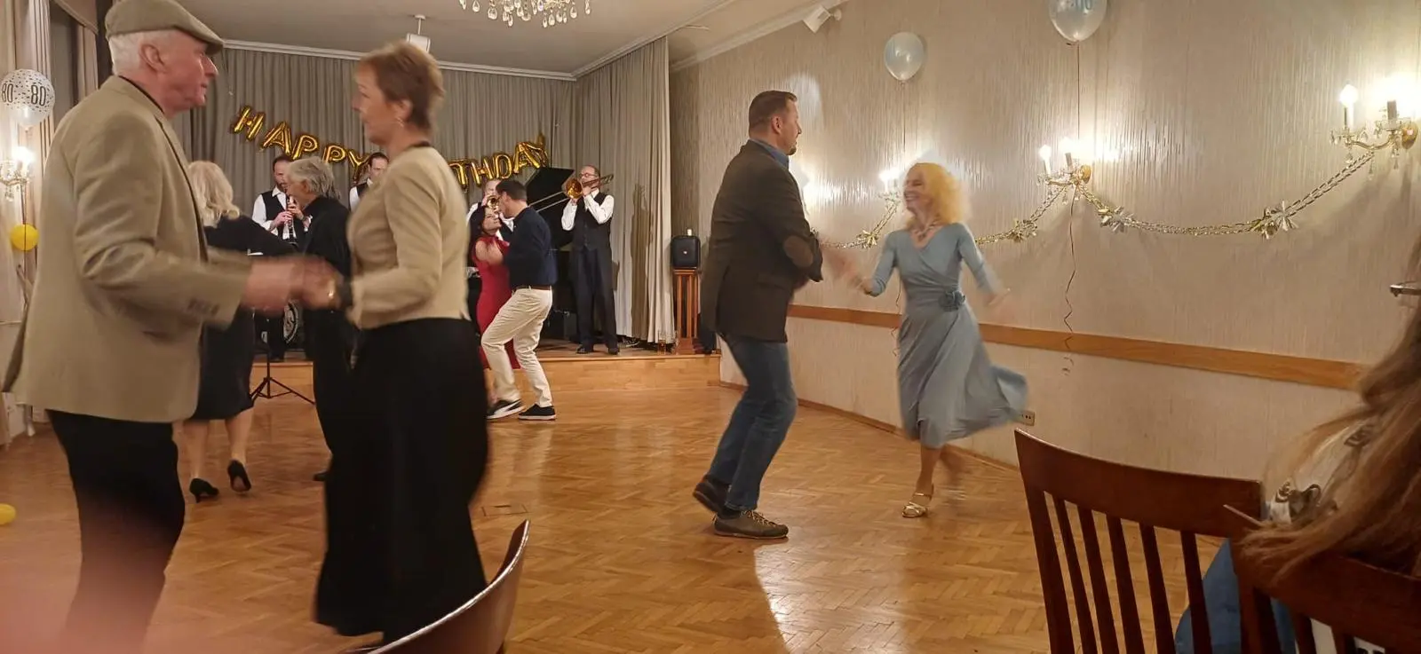 Ten večer nebyl pouze o seznamu hostů a dobrém pohoštění. Byl o atmosféře, která se nedá ani naplánovat, ani objednat. Prostě se stane, když se potkají správní lidé ve správný čas. Velký podíl na tom měli Viktorovi přátelé a zázemí v hotelu Pošta. A pak hlavně hudba, poctivý neworleanský jazz z Vídně, který si Viktor pozval přímo na míru. Riverside Stompers, osm nadšenců, rozjeli večer tak, že se během pár minut naladila celá místnost na stejnou vlnu. Hudba si postupně našla každého, někoho na parketu, jiného jen pohupujícího se u stolu.